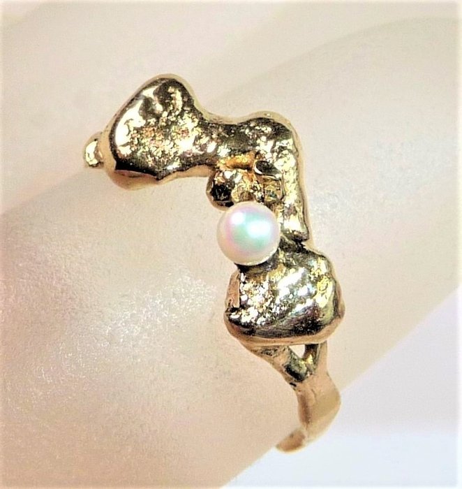 Ring van 585/14 kt geelgoud. De ring is handgemaakt door een goudsmid. Het ontwerp ziet eruit als een goudklompje. Aan de bewust onregelmatige vorm is een kleine rivierparel toegevoegd. Het creatieve ontwerp doet denken aan het werk van de Scandinavische modernisten.