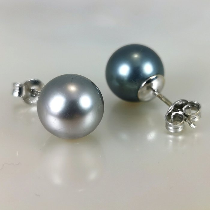 Prachtig paar grote Tahiti gekweekte parels oorbellen in WG18K ronde vorm Ø 11x12 MM. Natuurlijke donkergroene blauwachtige en lichtgrijze koperkleur met prachtige schakeringen.