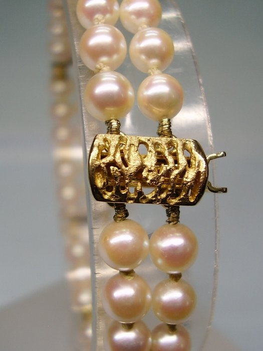 De elegante double-breasted Akoya gekweekte parelarmband heeft een armbandsluiting in geelgoud 333 = 8 karaat, ook geheiligd. De sluiting is gestempeld voor de bekende fabrikant J. Köhle, Pforzheim.