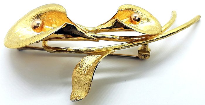 Juweel gemaakt met beweging van bloemen (callas) en blad, in satijn goud.