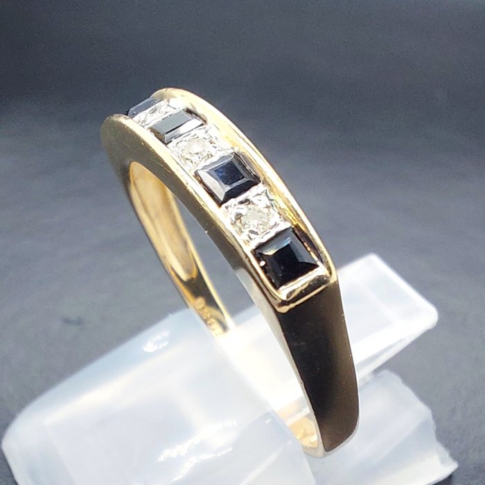 Edelsteen: 5 x prachtige vierkant geslepen blauwe saffieren van elk 3 mm met een totaal karaatgewicht van ongeveer 1,00 karaat, 4 x rond geslepen diamantpunten van elk 1,5 mm.