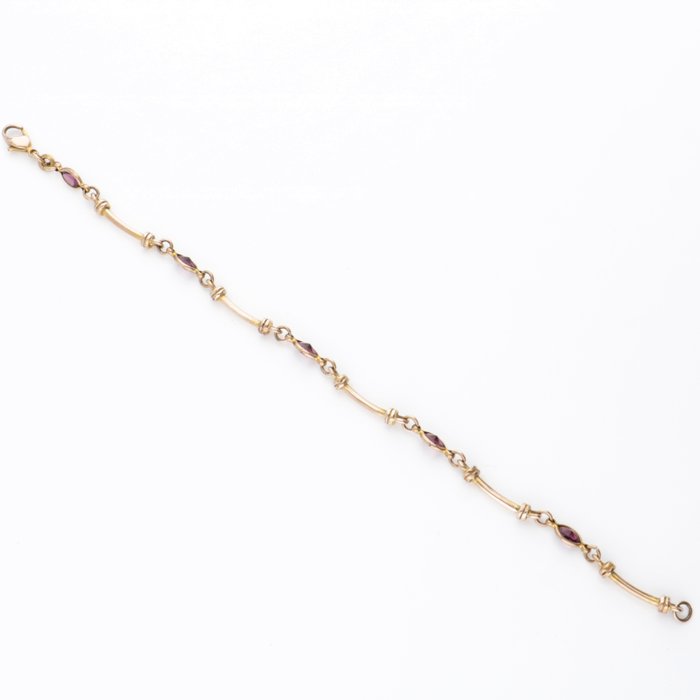 Geelgouden fantasieschakel armband, de armband is bezet met gekleurde strass stenen. Rechthoekige schakel worden afgewisseld door open kastzettingen welke bezet zijn met de gefacetteerde strass stenen.