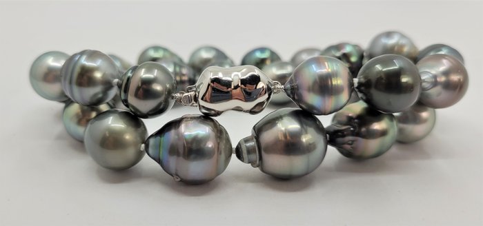 De in het oog springende kleur van de parels in de hele ketting toont de heldere multi-pauwkleuren van Tahiti-parels.