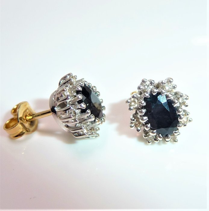 Oorbellen in 585 / 14 kt witgoud met geel goud op de achterkant. De oorbellen zien eruit als kleine ovale bloemetjes. In het midden bevindt zich een ovale, gefacetteerde saffier van in totaal 1,00 ct. De saffieren zijn elk omringd door 8 briljant geslepen diamanten. De 16 diamanten zijn in totaal 0,32 ct. (H/SI).