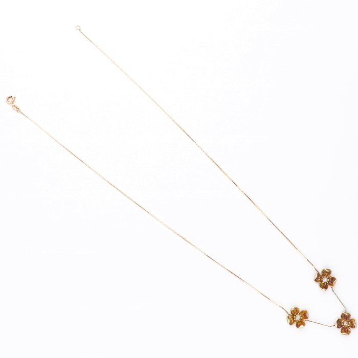 Geelgouden schakel collier het collier is in het midden voorzien van drie florale elementen welke elk bezet zijn met een single cut diamant van ca. 0.02 ct. De diamant zijn gezet in open kastzettingen.De florale details zijn elk voorzien van een gematteerde bewerking.
