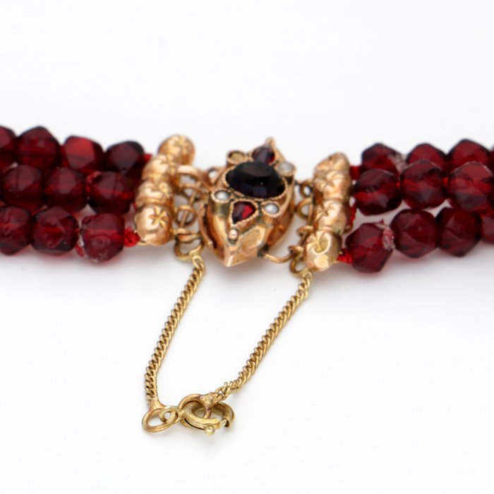 3-rijïge granaat collier voorzien van een 14 karaat geelgouden bakslot met een veiligheidskettinkje. Het bakslot is bezet met een ovaal gefacetteerde granaat, twee pear gefacetteerde granaten en 3 zaadparels. De granaten en parels zijn gezet in dichte kastzettingen. De granaten zijn geregen op rode rijggaren.