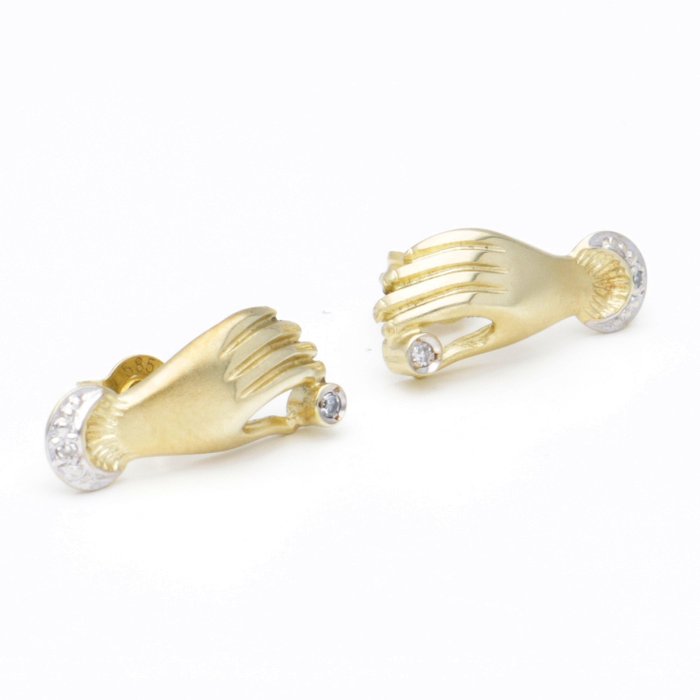 14 karaat geelgouden oorbellen bezet met totaal 4 single cut diamanten van totaal ca. 0.02 ct. De diamanten zijn gezet in open kastzettingen. De oorbellen zijn voorzien van de vormgeving van een hand.
