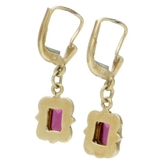 Geelgouden oorbellen ieder bezet met een emerald geslepen roze plaquette. De plaquettes zijn gezet in open kastzettingen. De oorbellen zijn voorzien van beweegbare details.