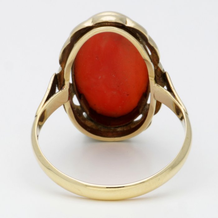 14 Karaat geelgouden vintage ring bezet met een cabochon geslepen bloedkoraal van ca. 12.07 ct. De bloedkoraal is gezet in een open kastzetting. De ring is voorzien van geschulpte en opengewerkte details.
