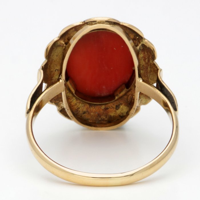 14 Karaat geelgouden vintage ring bezet met een cabochon geslepen bloedkoraal van ca. 2.37 ct. De bloedkoraal is gezet in een open kastzetting. De ring is voorzien van een gedetailleerde bewerking en opengewerkte details.