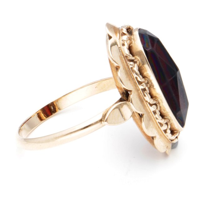 14 karaat geelgouden ring bezet met een ovaal gefacetteerde granaat van ca. 3.33 ct. De granaat is gezet in een open kastzetting. Het middenstuk van de ring is voorzien van opengewerkte, geschulpte en getorste details.