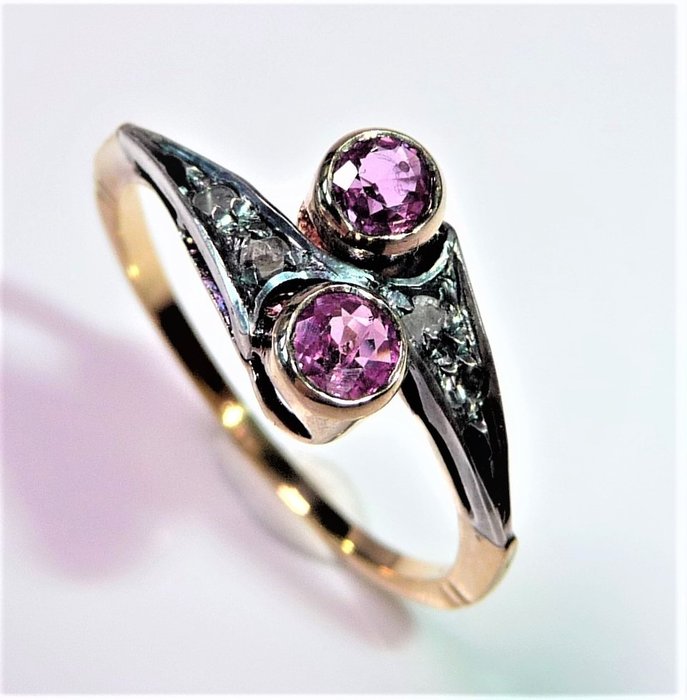Ring van 750/ 18 kt geelgoud. De ring is bewerkt in een gekruist ontwerp. De uiteinden lopen in het midden langs elkaar en hebben elk een robijn van in totaal 0,20 ct. scherp. In totaal 4 roosgeslepen diamanten sieren de schouders van de ring en hebben een totaal van 0,08 ct. (H/SI).