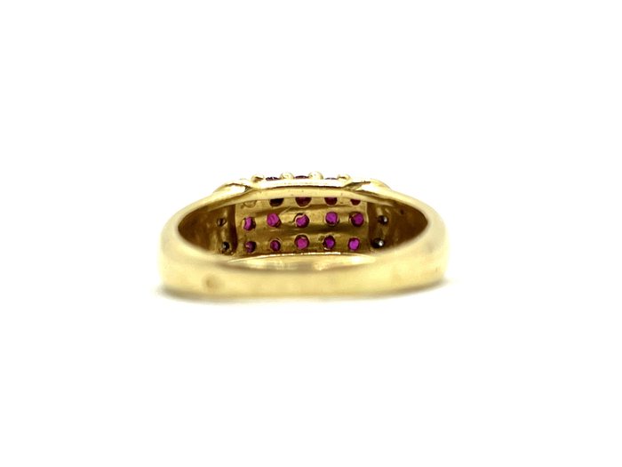 De bezel is bezet met een pavé van 15 rond briljant geslepen robijnen met een totaal gewicht van circa 0,60 karaat, in een entourage van 6 8/8 geslepen diamanten met een totaal gewicht van circa 0,03 karaat