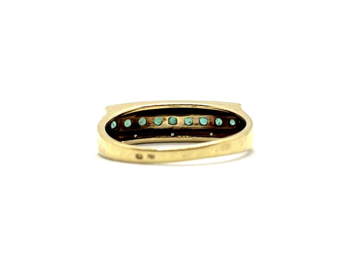 Juweel bezet met 9 rond briljant geslepen smaragden van 0,05 karaat, dus ongeveer 0,40 karaat in totaal, omgeven door 2 rijen van 3 8/8 geslepen diamanten van 0,01 karaat, dus ongeveer 0,06 karaat in totaal
