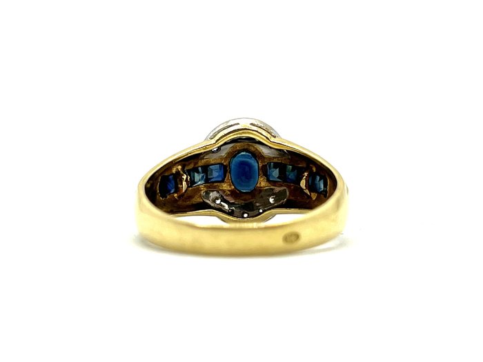 Bezel bezet met een ovaal geslepen saffier van 0,20 karaat en ondersteund door 8 gekalibreerde saffieren gerangschikt in riemen met een totaalgewicht van ongeveer 0,40 karaat, en 10 16/16-geslepen diamanten met een gewicht van 0,01 karaat, d.w.z. een totaal van ongeveer 0,10 karaat