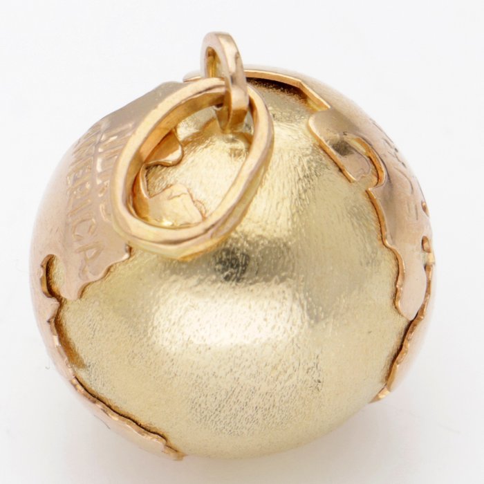Geelgouden hanger, de hanger is vormgegeven als de wereldbol. Op de bol zijn o.a. de volgende teksten gegraveerd: sud america, eurasia.