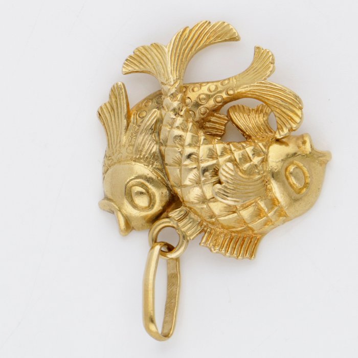 Geelgouden hanger, de hanger is vormgegeven in de gelijkenis van twee vissen die elkaar kruisen. De vissen zijn voorzien van een bewerking en hebben gematteerde delen.
