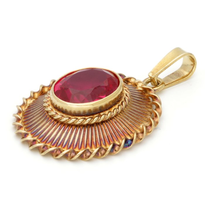 18 Karaat geelgouden hanger bezet met een synthetisch ovaal gefacetteerde saffier van ca. 2.5 ct., welke is gezet in een open kastzetting. De hanger is voorzien van draadwerkrand.