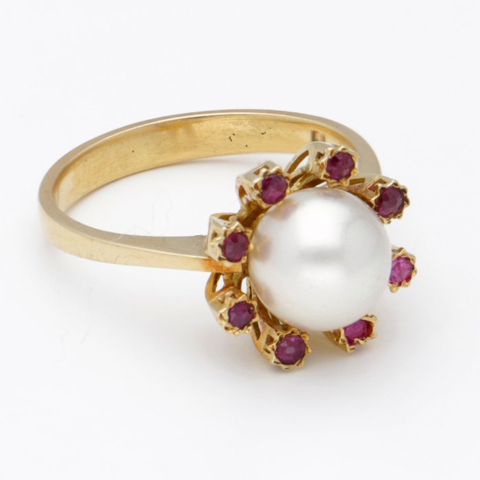 18 karaat geelgouden ring bezet met een witte ronde parel en 8 rond gefacetteerde synthetische robijnen van totaal ca. 0.16 ct. De robijnen zijn gezet in open zettingen.