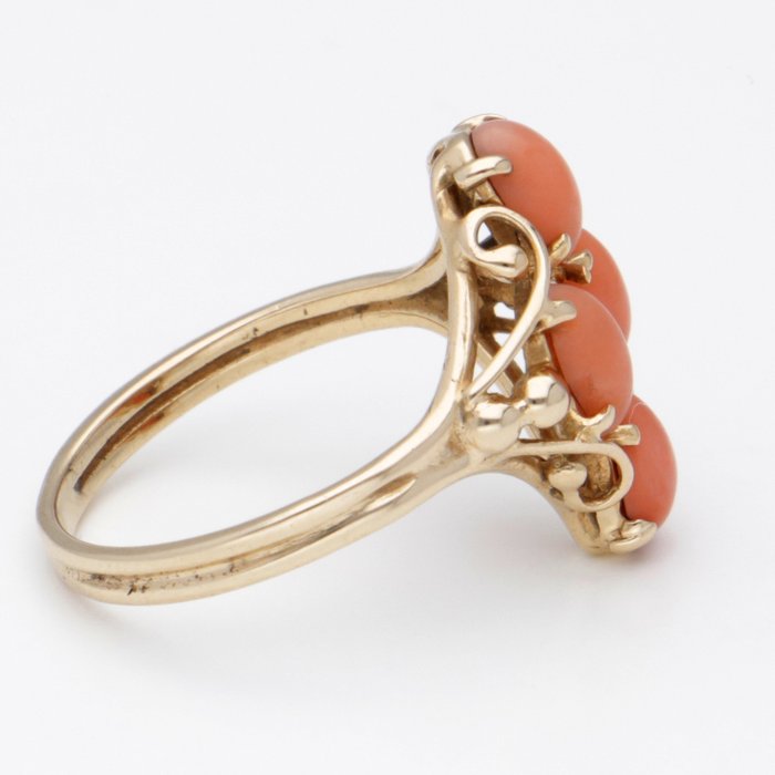 18 karaat geelgouden ring bezet met vier cabochon geslepen bloedkoralen van totaal ca. 1.00 ct. De bloedkoralen zijn gezet in een open chatonzetting. Het middenstuk is voorzien van sierlijk opengewerkte details.