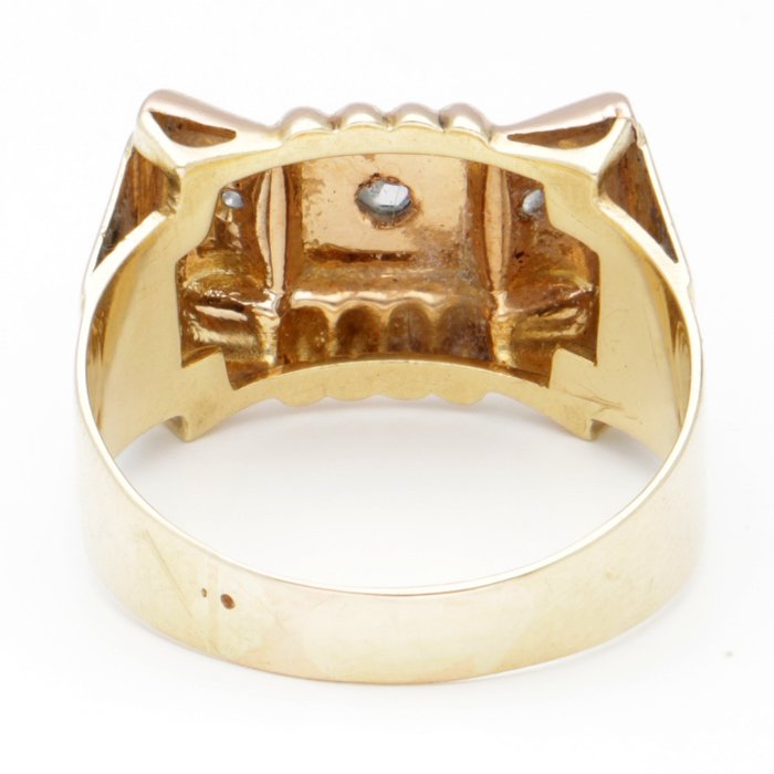 18 karaat geelgouden tankring bezet met 3 roosgeslepen diamanten. De ring is voorzien van symmetrische details. De zetkast is vervaardigd uit 18 karaat witgoud.