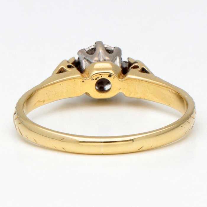18 Kt. geelgouden vintage ring bezet met een briljant geslepen diamant van ca. 0.027 ct. De diamant is gezet in een witgouden open zetting. De ring is voorzien van een sierlijk witgouden middenstuk , en aan weerszijden sierlijke bewerkingen en opengewerkte details.