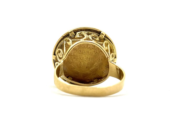 Ring in 18 karaat roze goud bezet met een Franse Napoleon III type 10 Frank munt in 900/1000 goud (22 karaat) met een gewicht van ongeveer 3,22 g