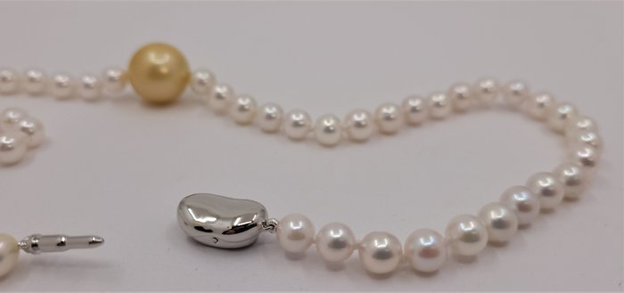 Het collier heeft een lengte van 45cm en is gemaakt met gekweekte Akoya parels van 6x6.5mm in doorsnee en een prachtige diepgouden parel van 14.8mm in doorsnee, wat voor een bijzonder effect zorgt in dit unieke collier.