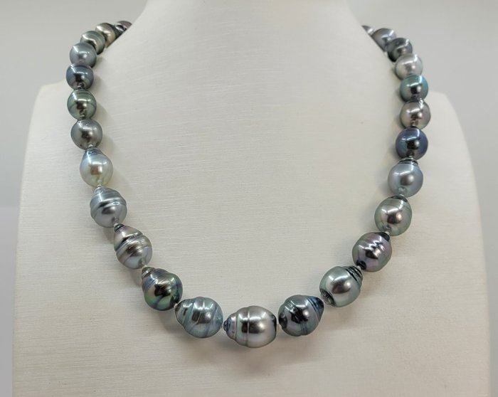Een prachtige veelkleurige halsketting van Tahiti-parels, geselecteerd vanwege hun glinsterende pauw-, olijf- en zilveren boventonen, en afgewerkt met een bijpassende sluiting in massief zilver.