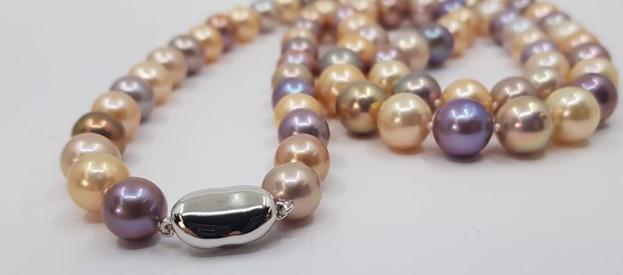 Deze ketting bevat Edison-parels die zijn gekozen vanwege hun heldere glans die kan worden vergeleken met die van hoogwaardige zoutwaterparels, en vanwege hun paarse, roze en gouden kleurschakeringen.