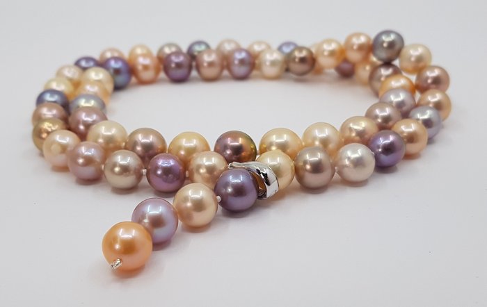Deze ketting bevat Edison-parels die zijn gekozen vanwege hun heldere glans die kan worden vergeleken met die van hoogwaardige zoutwaterparels, en vanwege hun paarse, roze en gouden kleurschakeringen.