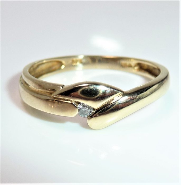 Ring van 585/14 geelgoud. De ring heeft een briljant geslepen diamant van 0.03 ct. (G/VS) geslepen. De diamant is gekeurd met 0.03 in de ringband. Interessant ontwerp dat de diamant een zeer originele zetting geeft.