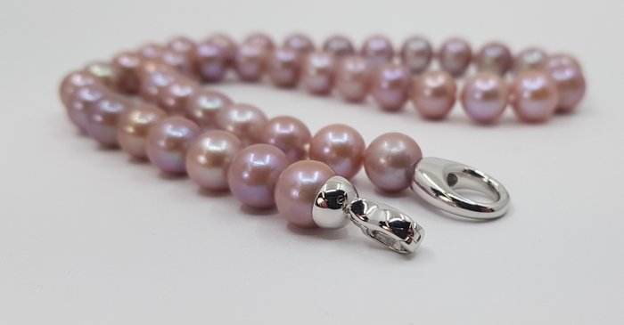De parels hebben een diameter van 10x11,5 mm, waardoor er een lichte gradatie ontstaat aan de voorkant van de ketting.