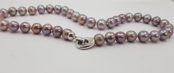 De ketting is voor de veiligheid tussen elke parel geknoopt en is afgewerkt met een elegante sluiting van massief zilver.