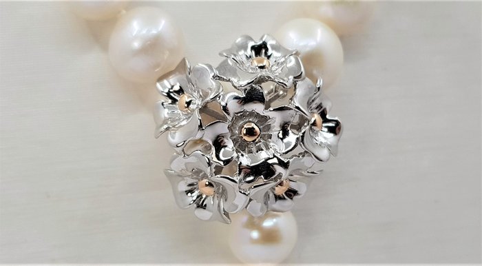 Individueel geknoopt tussen elke parel voor de veiligheid, de ketting is afgewerkt met een elegante bloemsluiting in massief zilver.
