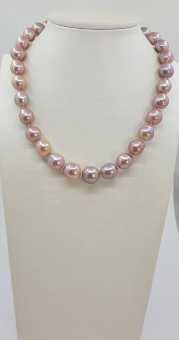 De parels hebben een diameter van 11x14 mm, waardoor er een lichte graduatie ontstaat aan de voorkant van de ketting.
