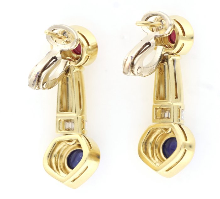 18kt gouden oorbellen met saffieren, robijnen en diamanten.