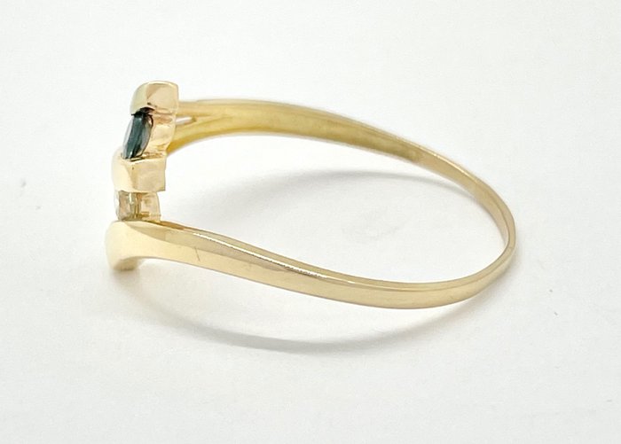 En een blauwgroene ronde saffier van ongeveer 0,10 karaat (3 mm)