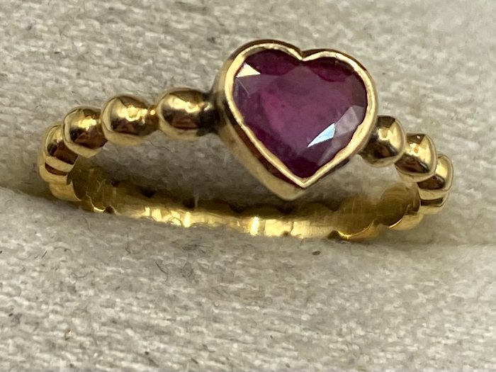 18kt gouden ring met hartgeslepen robijn in het midden.