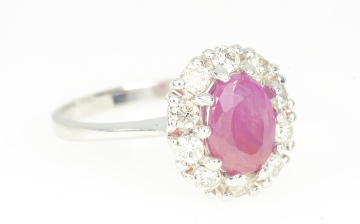 18kt witgouden ring met ovaal geslepen robijn in het midden en briljant geslepen diamanten van totaal 0,70 ct.