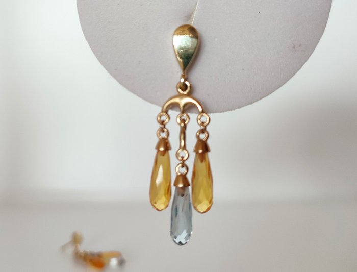 333 karaat gouden dames oorhangers met een lichtblauwe spinel en 2 citrienen.