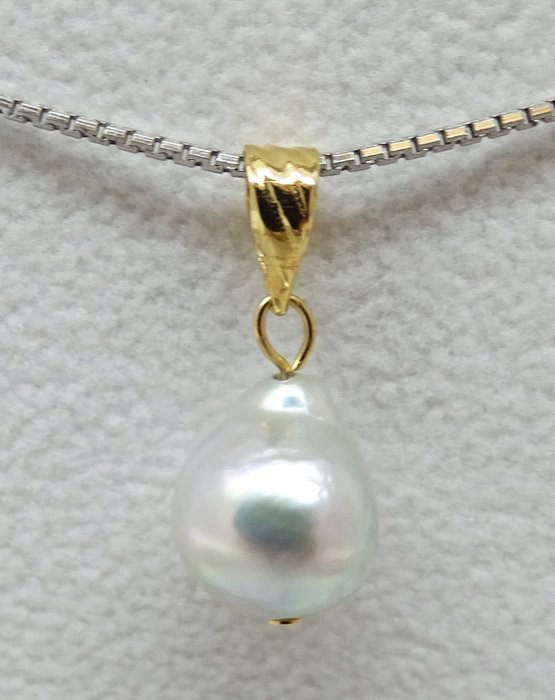 Deze prachtige hanger heeft een exotische en modieuze, zeldzame, natuurlijke blauwe, barokke Japanse Akoya-kweekparel met extreem dik paarlemoer en spiegelachtige glans. Gekenmerkt door hun onregelmatige, vervormde vormen, geven veel parelliefhebbers de voorkeur aan de natuurlijke look en feel van deze zogenaamde "barokke" gekweekte Japanse parels. Beveiligd aan een klassieke, hoogglans gepolijste 18K massief gouden baal, vormt de hanger een enorme 9.04x10.7mm natuurlijke blauwe barokke Japanse Akoya gekweekte parels.