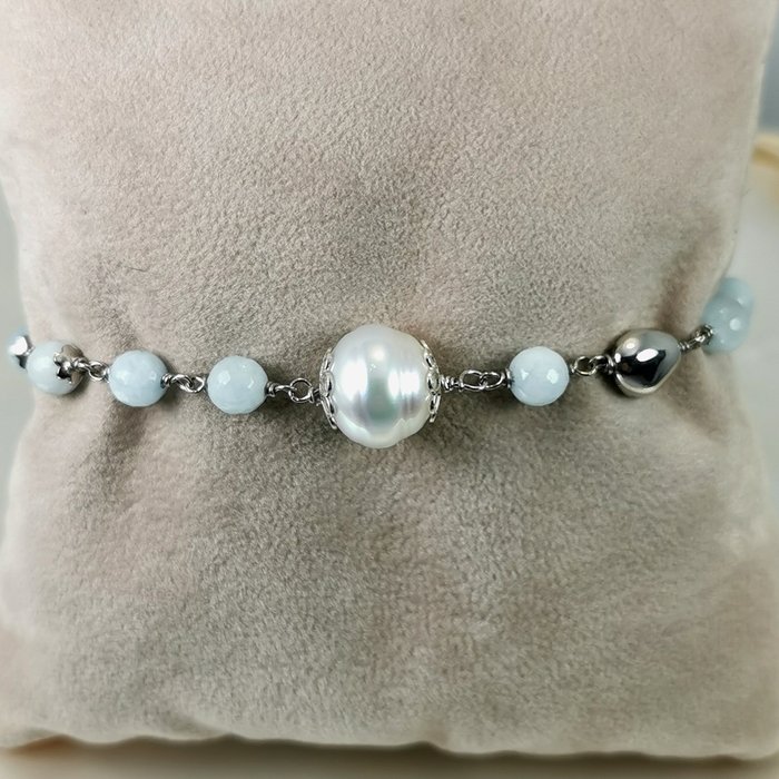 Mooie enorme Australische Southsea gekweekte parel natuurlijke kleur armband met halfedelstenen Aquamarijnen rond gefacetteerd Ø 6,5 mm in 925% zilver met Keurmerken. Verstelbare lengte van 19 tot 22 cm.