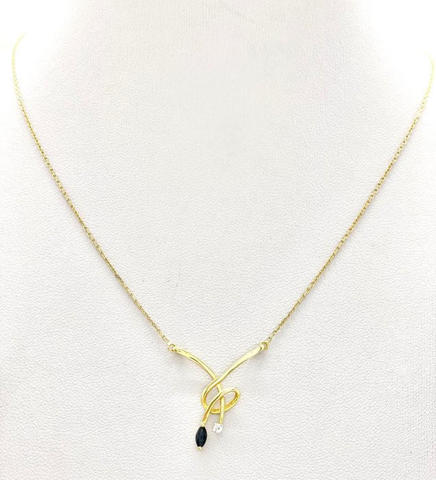Versierd met 1 marquise-cut saffier van 0,15 karaat (4,4 x 2,5 mm) en een briljant geslepen diamant van ongeveer 2 mm