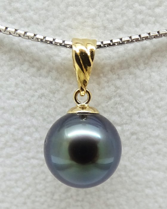 Rikitea parel, blauwe middernacht Tahitiaanse parel 9,73 mm hanger, 18K geel goud (GEEN RESERVE PRIJS)