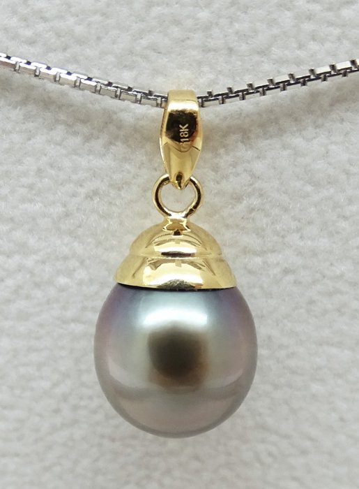 Zilverachtige duif violette druppelvormige Tahitiaanse parel 9,81 mm x 10,8 mm hanger AAA-classificatie, 18K geel goud (GEEN RESERVEPRIJS)