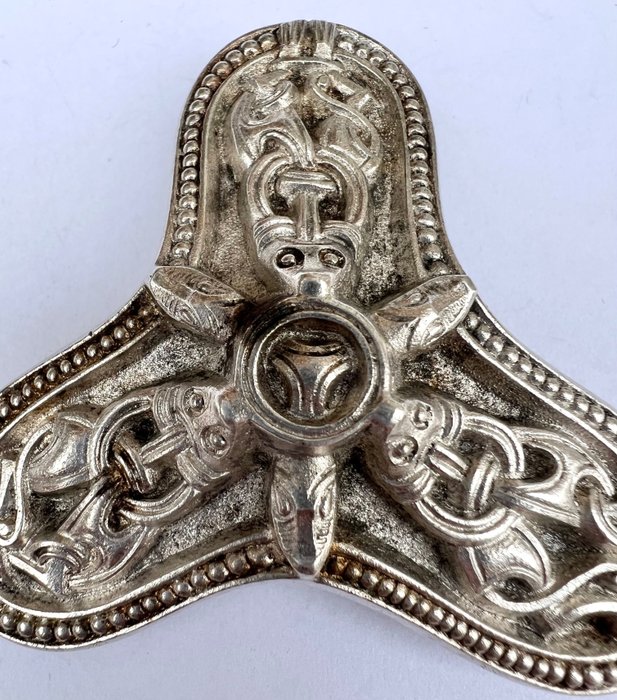 Een grote en prachtige vintage broche met een ingewikkeld Noors patroon dat bekend staat als grijpbeesten in Borre-stijl - humoristische dieren die zichzelf of andere dingen om hen heen vastgrijpen. Het patroon is geïnspireerd op historische vondsten uit de 9e - 10e eeuw die in Noorwegen zijn ontdekt.
