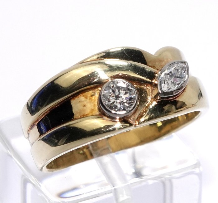 Massief handgemaakte vintage bandring in 585/14 kt geel- en witgoud. De bandband is vloeiend gebeeldhouwd vanaf de ringschouders op het oppervlak en houdt een paar diamanten in verschillende geslepen vormen in het hoofd. Beide diamanten zijn gezet in witgouden lijsten. Effectieve dialoog tussen een oud geslepen diamant en een marquise geslepen diamant. Heel goede staat.