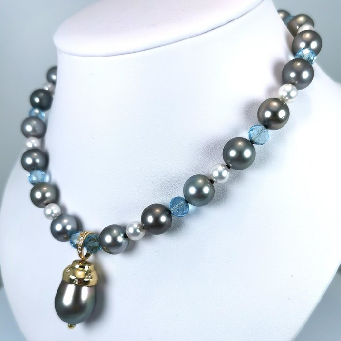 Schitterende Tahiti+Akoya kweekparels ronde vorm - Grootte van Ø 7 tot 12 mm met een YG18K sluiting (0,8 grm) en een enorme prachtige diamanten hanger met Tahiti DR vorm Ø 16,2 tot 21 mm.