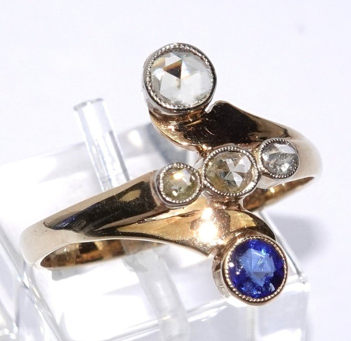 Vintage twin ring in 585/14 kt geel goud met platina kop zettingen. De ronde monturen versierd met mille handvatten zijn bezet met 4 roosgeslepen diamanten en een rondgeslepen saffier. De ring (huidige maat 64/20,4 mm) kan worden verkleind tot maat 55/17,5 mm (zie hieronder). Heel goede staat.